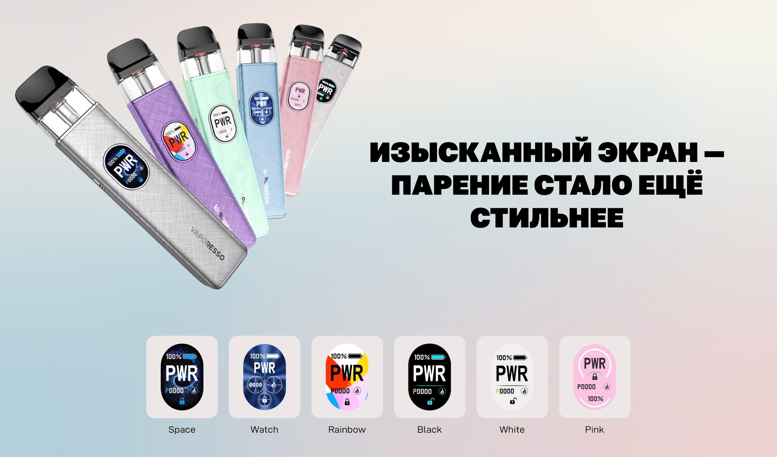Устройство имеет яркий цветной дисплей, который показывает уровень заряда, установленную мощность, счетчик затяжек и сопротивление картриджа, таким образом вся информация под рукой, без гаданий. Вы также можете менять визуализацию: несколько тем оформления позволяют подобрать внешний вид экрана под настроение или образ.