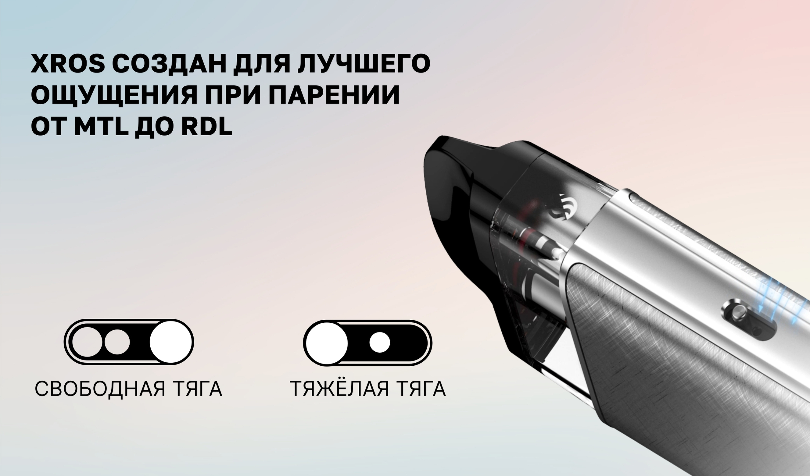 XROS 5 комплектуется двумя сетчатыми картриджами объемом 3 мл: 0.4 Ω (установленный) и 0.6 Ω. Оба обеспечивают чистую передачу вкуса и плотный пар благодаря сетчатым испарителям. Устройство совместимо со всей линейкой картриджей XROS, включая обновленные Corex 3.0.